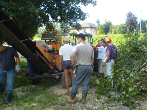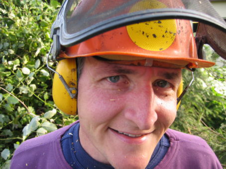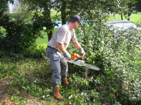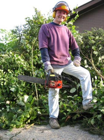 Gut ausgerüstet mit Motorsäge, Trimmer, Häcksler,